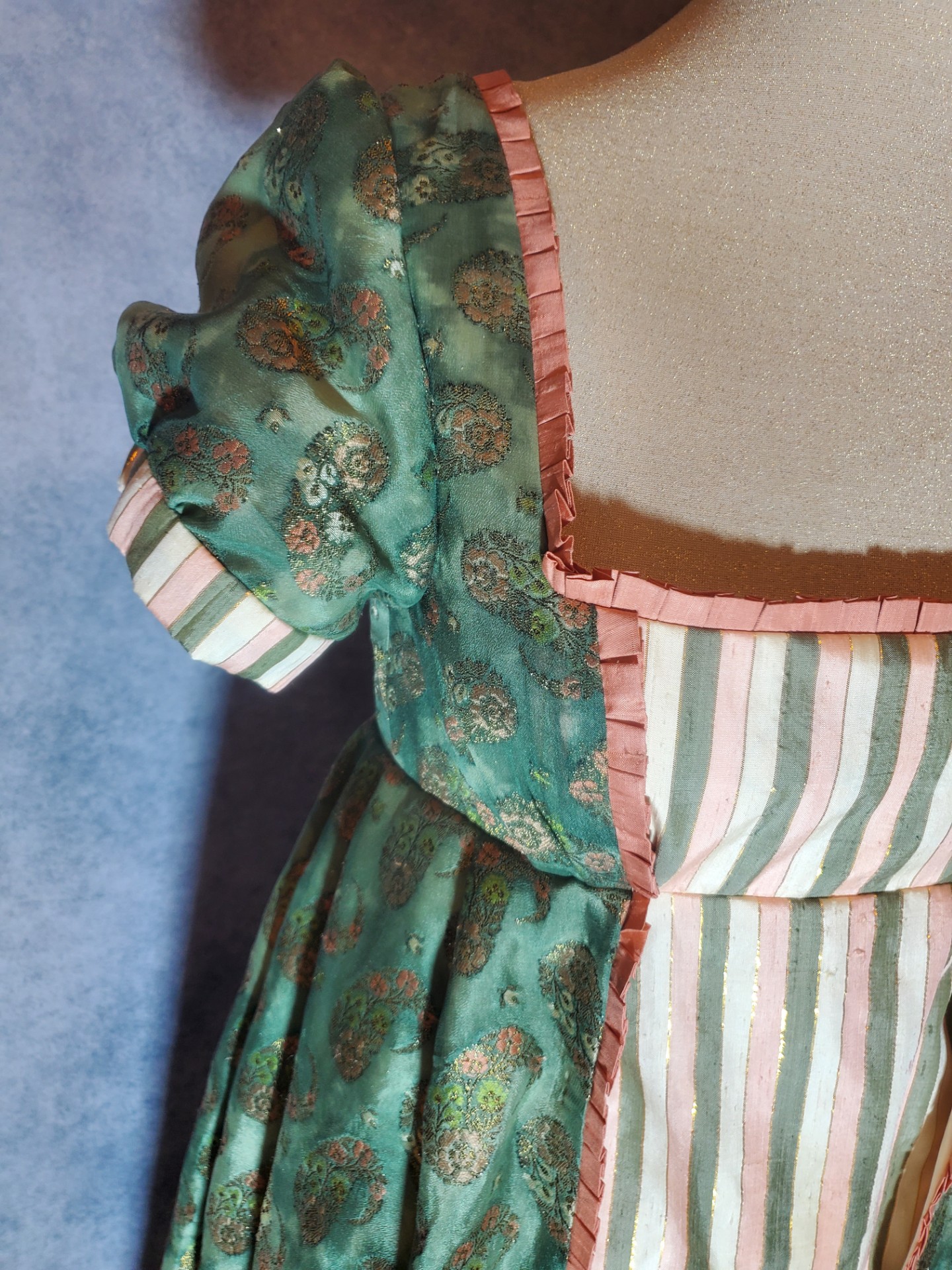 Délicatesse des tons, audace du motif fleuri allié aux rayures pour cette précieuse robe 1er Empire. Elle convient à la perfection aux thèmes Bridgerton et Jane Austen.
