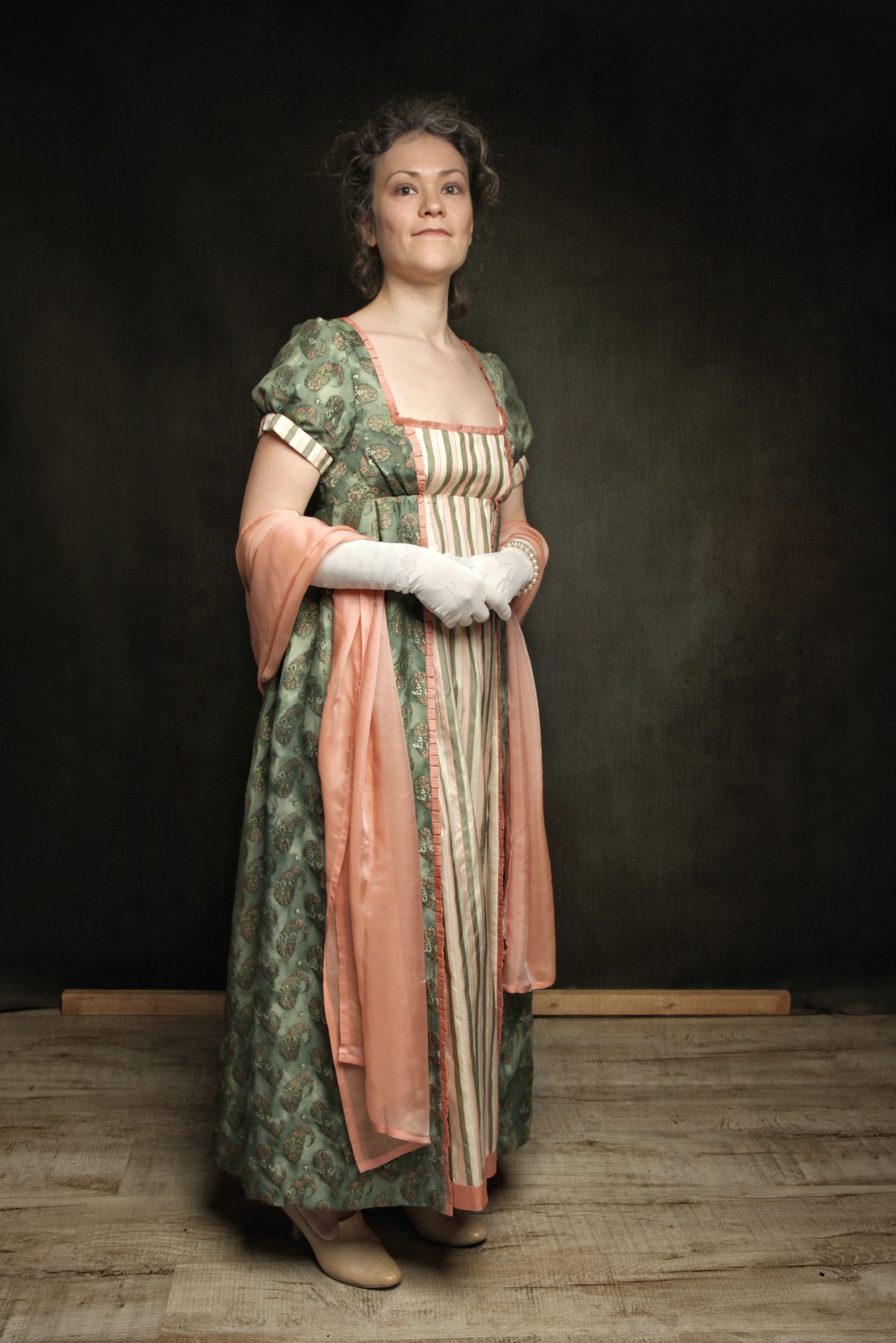Robe 1er Empire Saumon et Vert est le costume idéal pour les thèmes « Bridgerton » et Jane Austen. Tons clairs et délicats pour incarner un personnage aux manières délicieuses et à l’esprit alerte. A vous les admirateurs les plus dévoués …