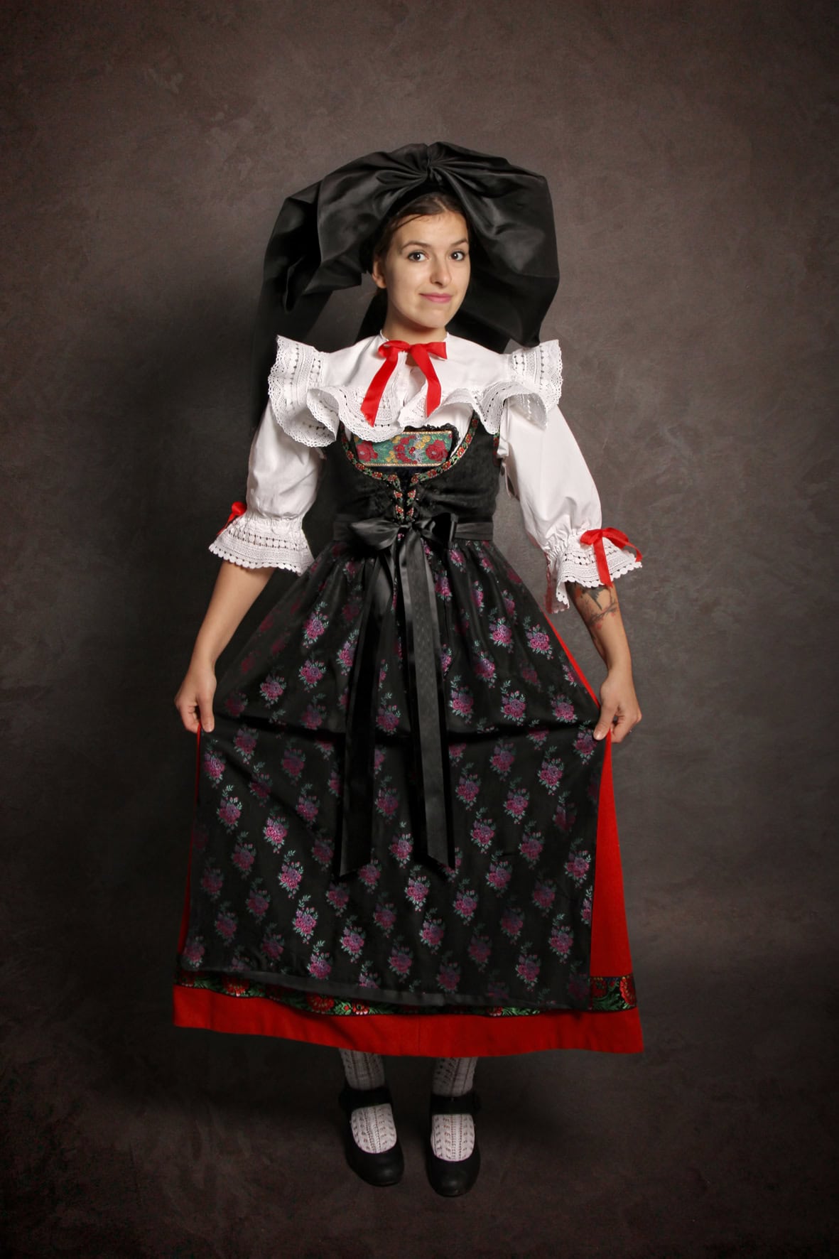 Alsacienne traditionnelle est un costume féminin du Kochersberg, Pays de Hanau. Alliance du rouge, du noir, de rubans fleuris et d’une coiffe à grand noeud qui incarnent l’Alsace dans le monde entier.