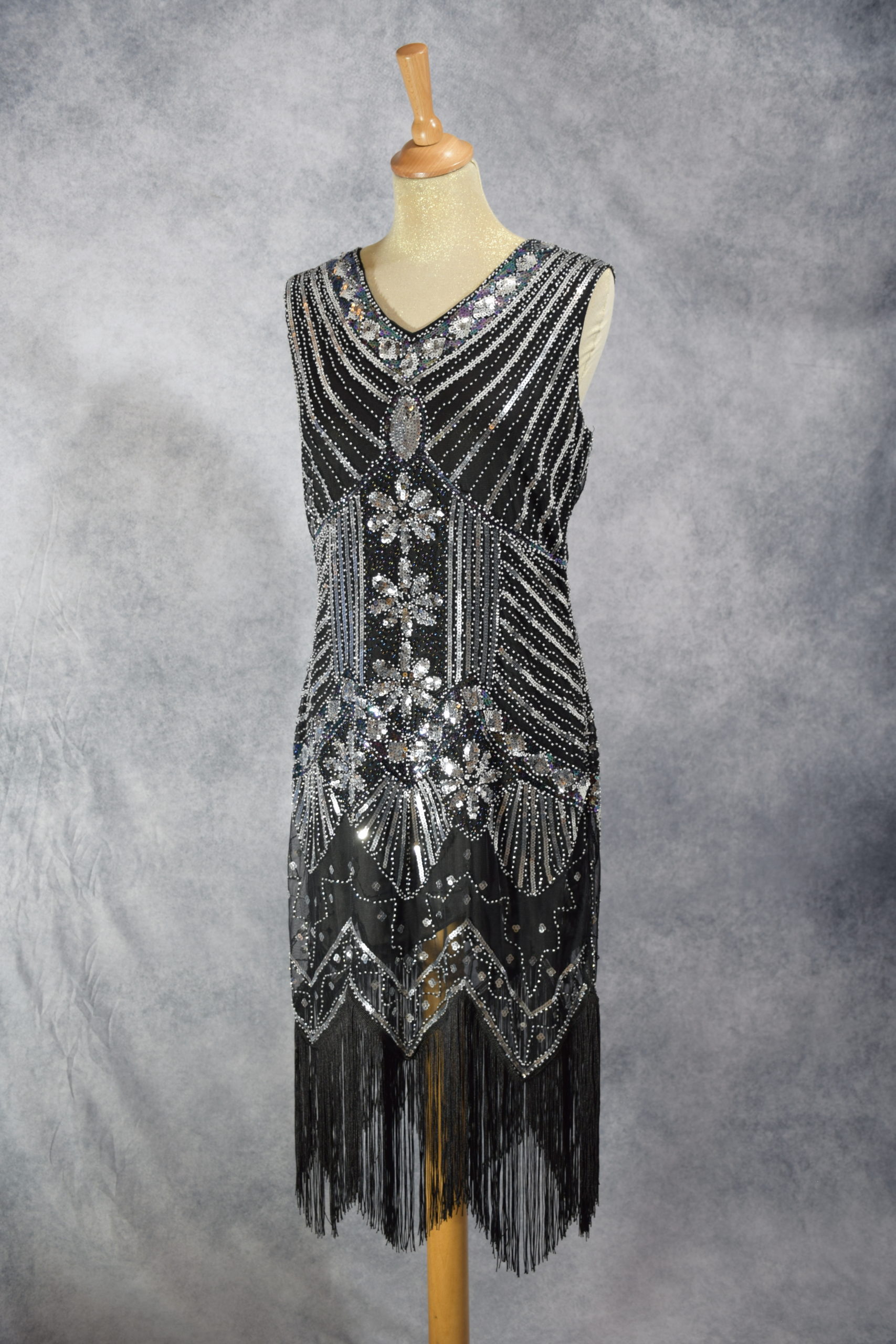 Roaring Twenties dress made up of black lining under black veil dress embroidered with silver pearls and sequins. Beautiful V neckline on front and back. Long black fringes to set off the legs. Size : XL.