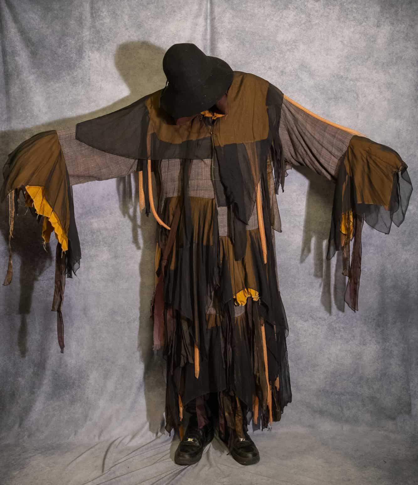 Costume Epouvantail se compose d’un long et large manteau, qui se ferme sur le devant par des velcros.