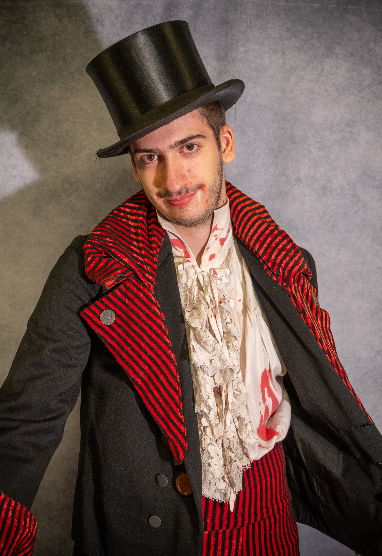 Vous portez une étrange redingote décorée de boutons noirs et marron. Des revers de tissu rayé noir et rouge animent le grand col et les manches. Au dos, de petites basques. Dessous une chemise ensanglantée à manchettes de dentelle et un jabot. Un pantalon 7/8 à ceinture large en tissu rayé noir et rouge. Un haut de forme et des nœuds de chaussures noirs apportent la touche finale.