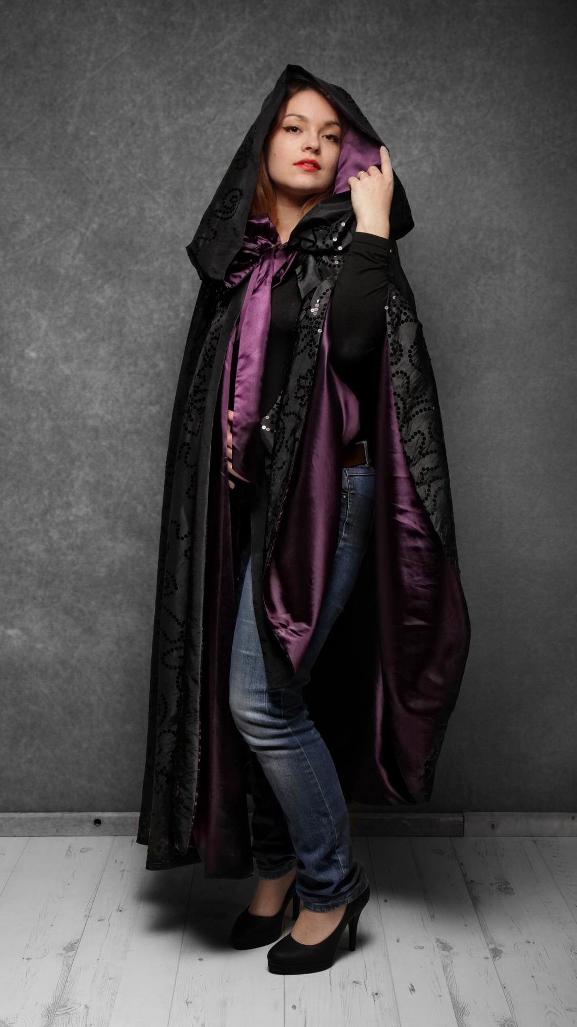 Vous portez une veste longue de dentelle rouge pailletée sur un crêpe de satin bleu canard, un pantalon de lamé or , un riche jabot à volants violet/bleu canard/rouge, une coiffe haute ornée de galons dorés et de fleurs, une cagoule et des gants.