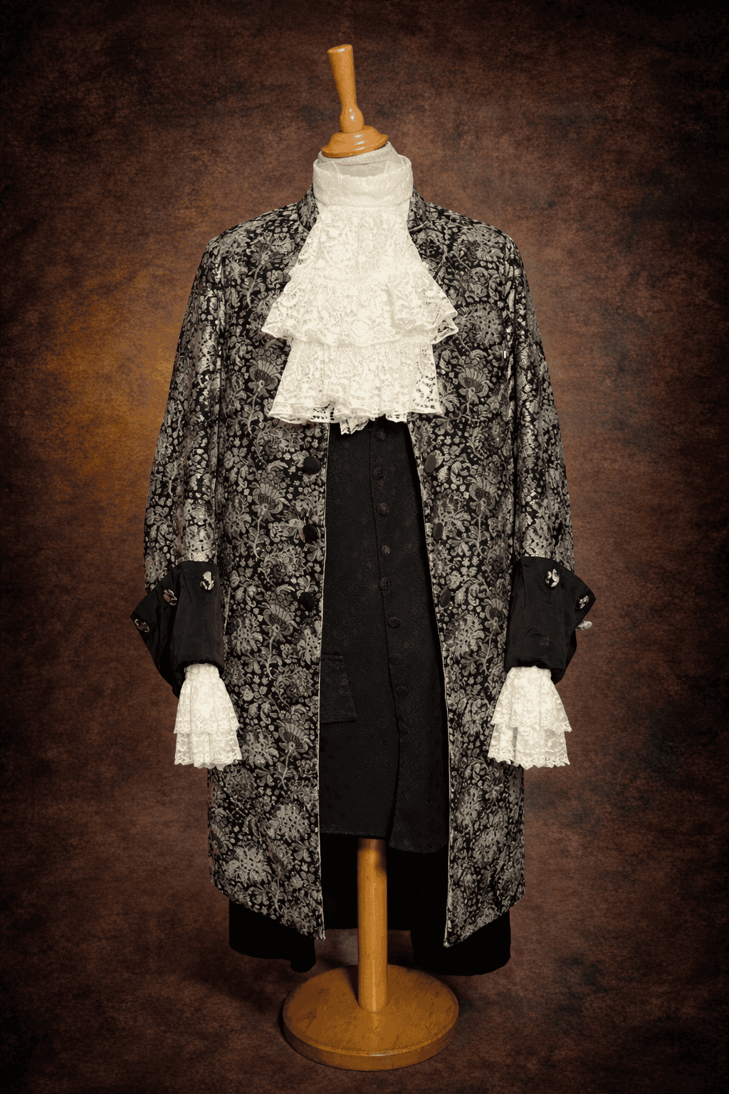 – Un justaucorps (veste) damassé dont es manches se terminent par de généreux revers ornés de boutons noirs.