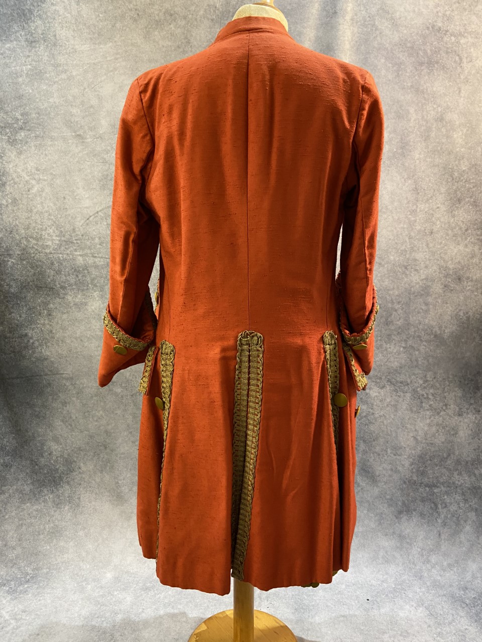 Typical eighteenth century men’s outfit made up of shirt with white lace ruffle, ecru flowers embroidered silk waistcoat and plain khaki shantung (silk) breeches. Beautiful light red jacket embellished with old gold coloured trimmings. White high socks and tricorn bring the final touch. Size L. Handmade creation. Unique item.
