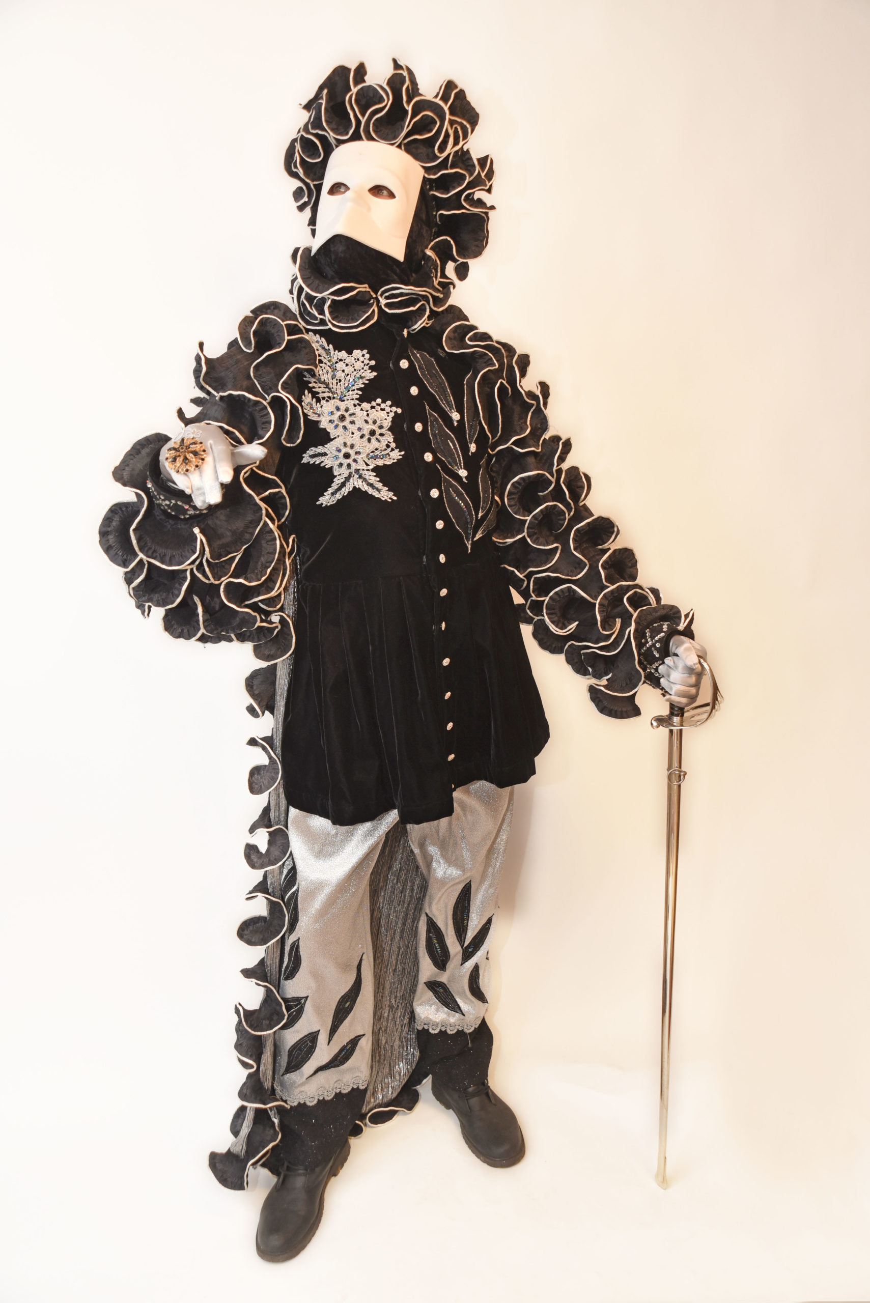 Vous portez une veste de velours noir embellie d’une collerette liserée argent et de remarquables manches à volants, ceinturée, un pantalon lamé argent incrusté de motifs feuilles noires, une cape lamée argent bordée d’un volant noir liseré argent, une coiffe ornée de volants noirs liserés argent, une cagoule et des gants.