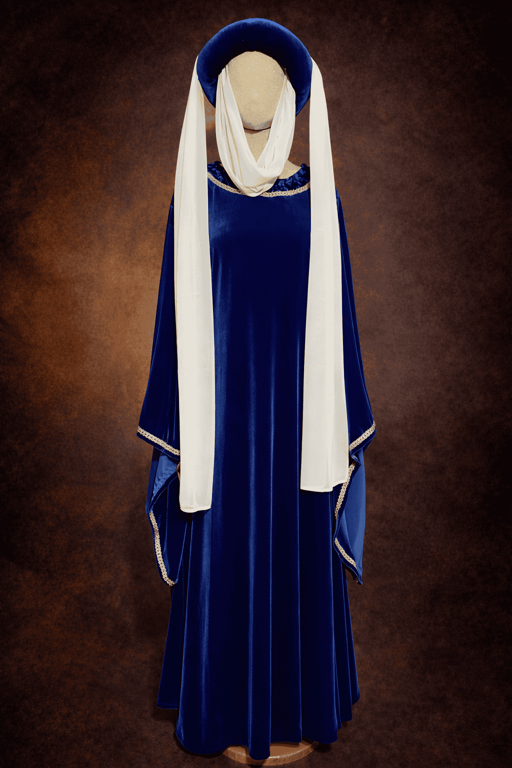 Longue silhouette de velours bleu vêtue, vous portez une robe à manches droites et évasées enrichie de galons argentés. Une coiffe de velours bleue et d’un voile blanc.