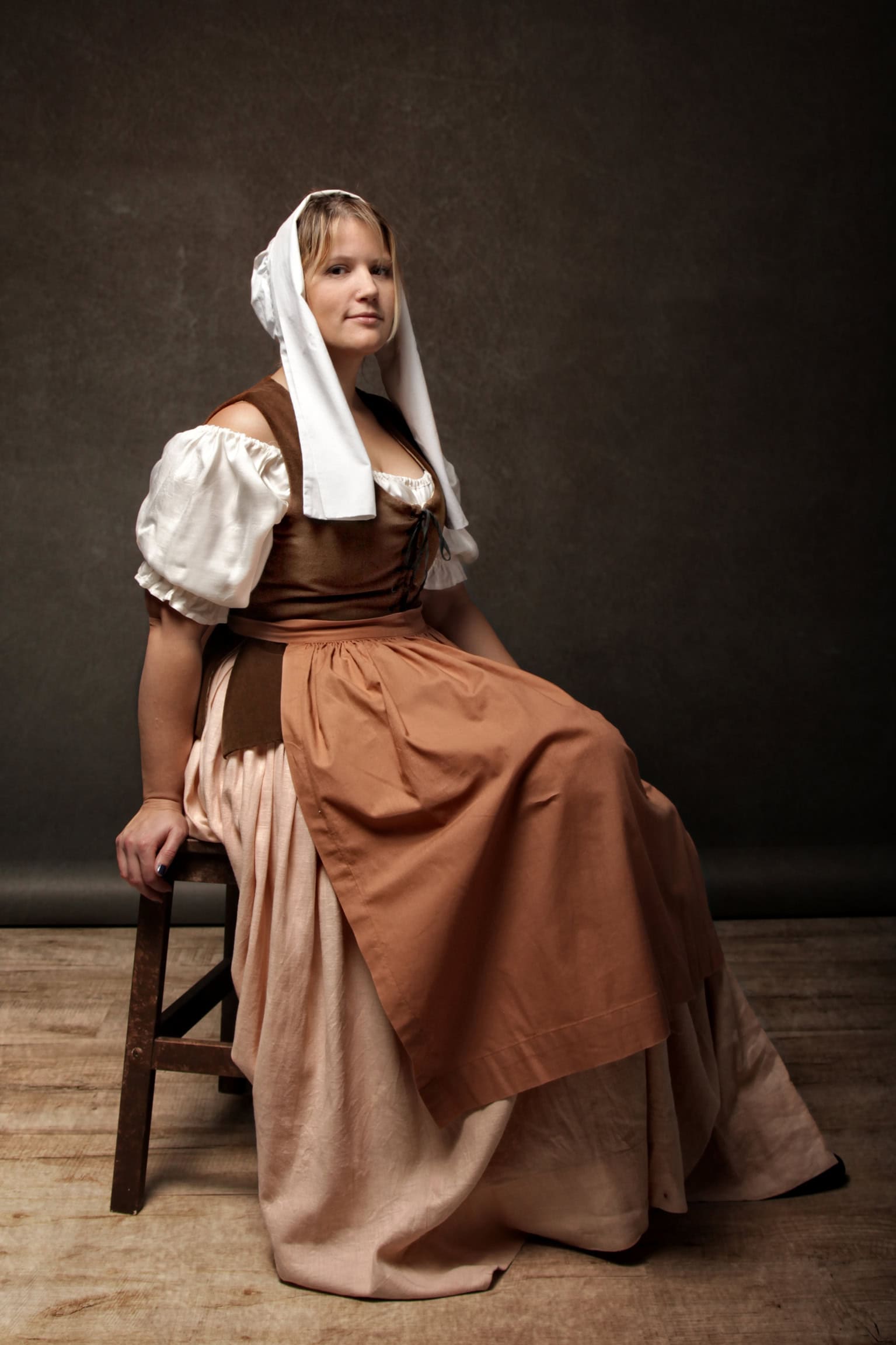 Sur une chemise blanche à manches bouffantes coquettement descendues sur les épaules, vous portez un corselet de velours à larges bretelles marron, un grand tablier marron glacé sur une jupe beige rosé. Un jupon blanc donne de la tenue tandis qu’une coiffe apporte un peu d’ingénuité.