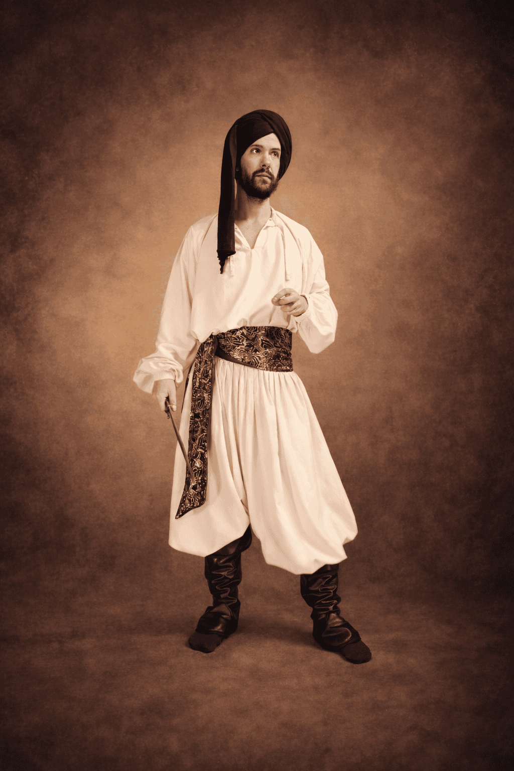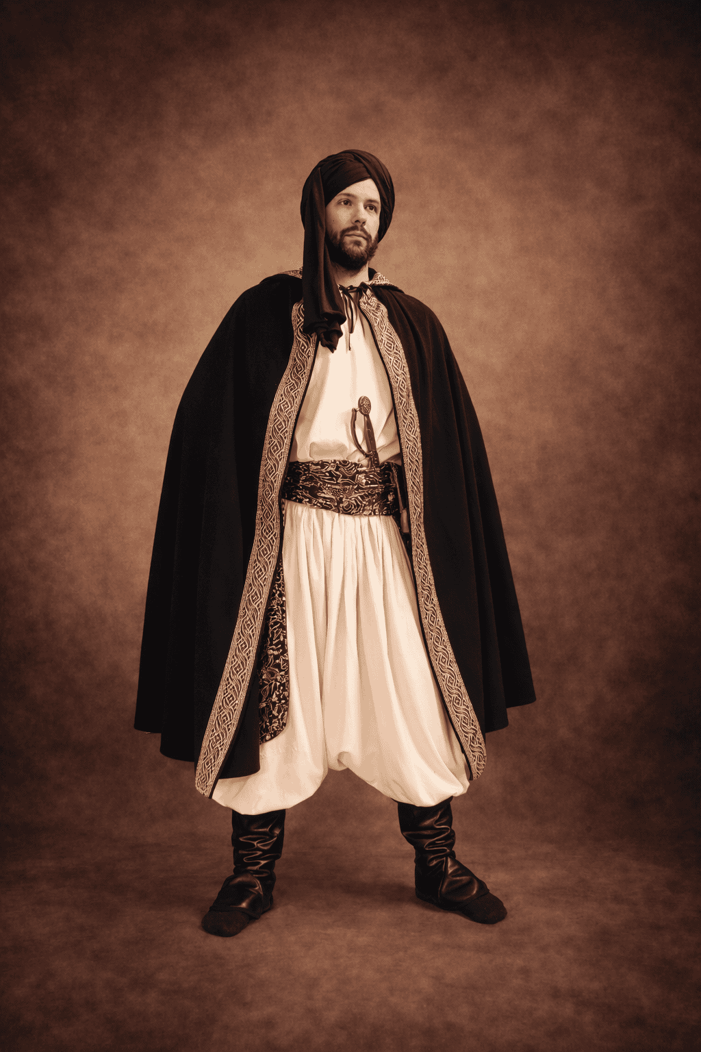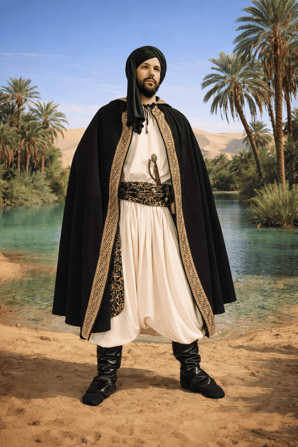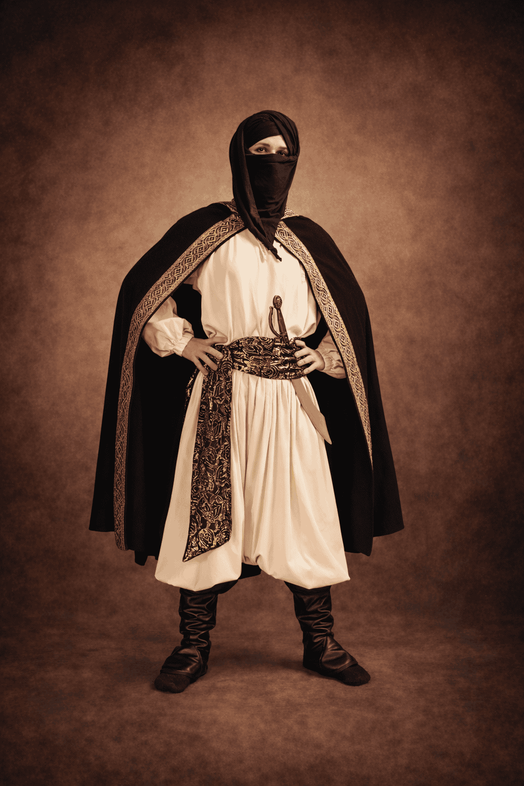 La silhouette se compose d’une tunique, d’un sarouel, d’une ceinture, de sur-bottes, d’un turban et d’un cimeterre.
