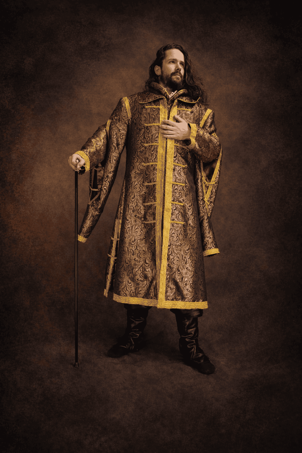La silhouette se compose d’un somptueux manteau à double col et à doubles manches, d’un pantalon, de sur-bottes et d’une coiffe.