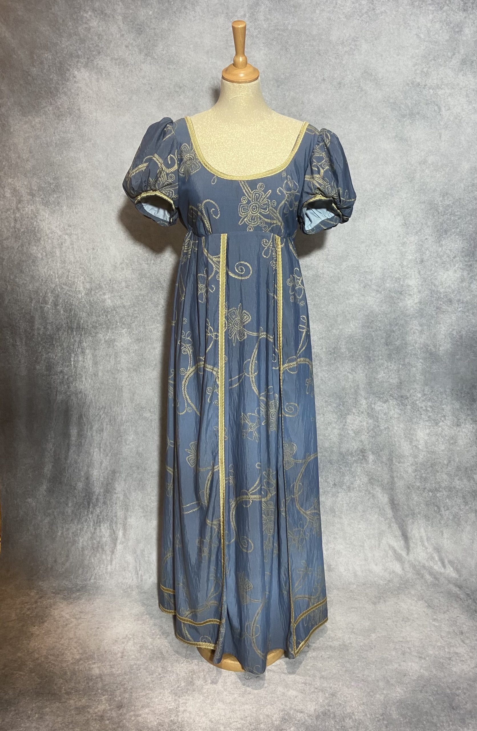 Petite merveille de douceur et de raffinement pour cette robe 1er empire qui allie le bleu et le doré.