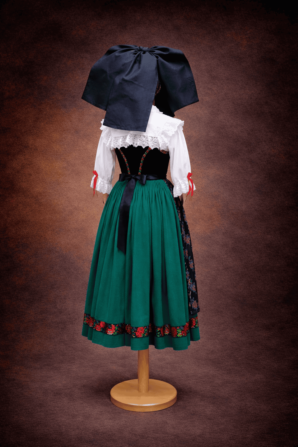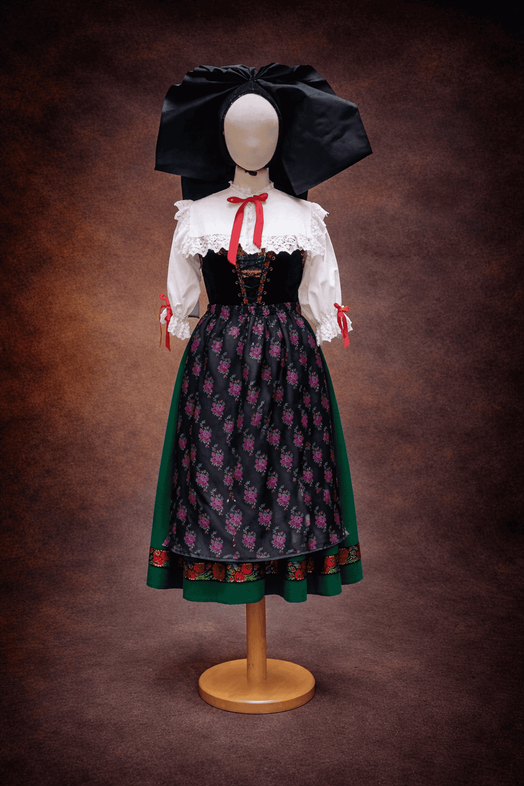 Robe alsacienne verte. Elle se compose d’une robe de drap de laine verte avec corselet noir, un chemisier blanc, une collerette blanche, une plaque d’estomac, un tablier et une coiffe.