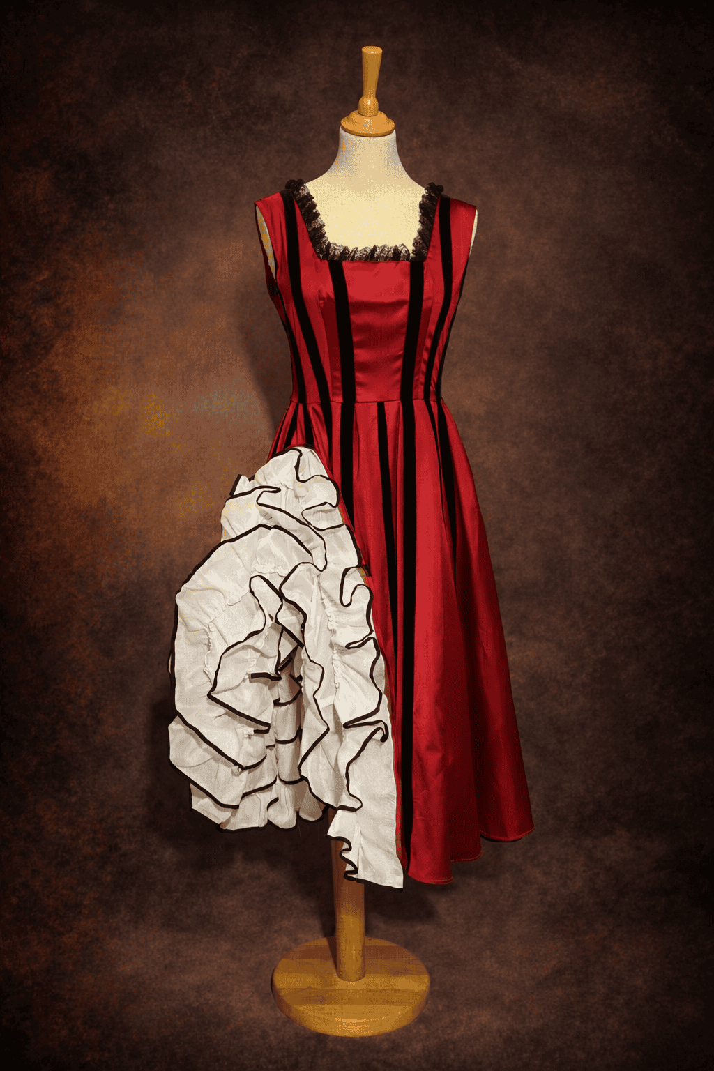 Vivacité pétillante et gaie pour cette robe rouge à rayures noires, s’ajoute un jupon à volants ainsi qu’une culotte blanche à froufrous et une jarretière noire pour la touche coquine. Un ruban de cou et une coiffe à plume complètent la silhouette.