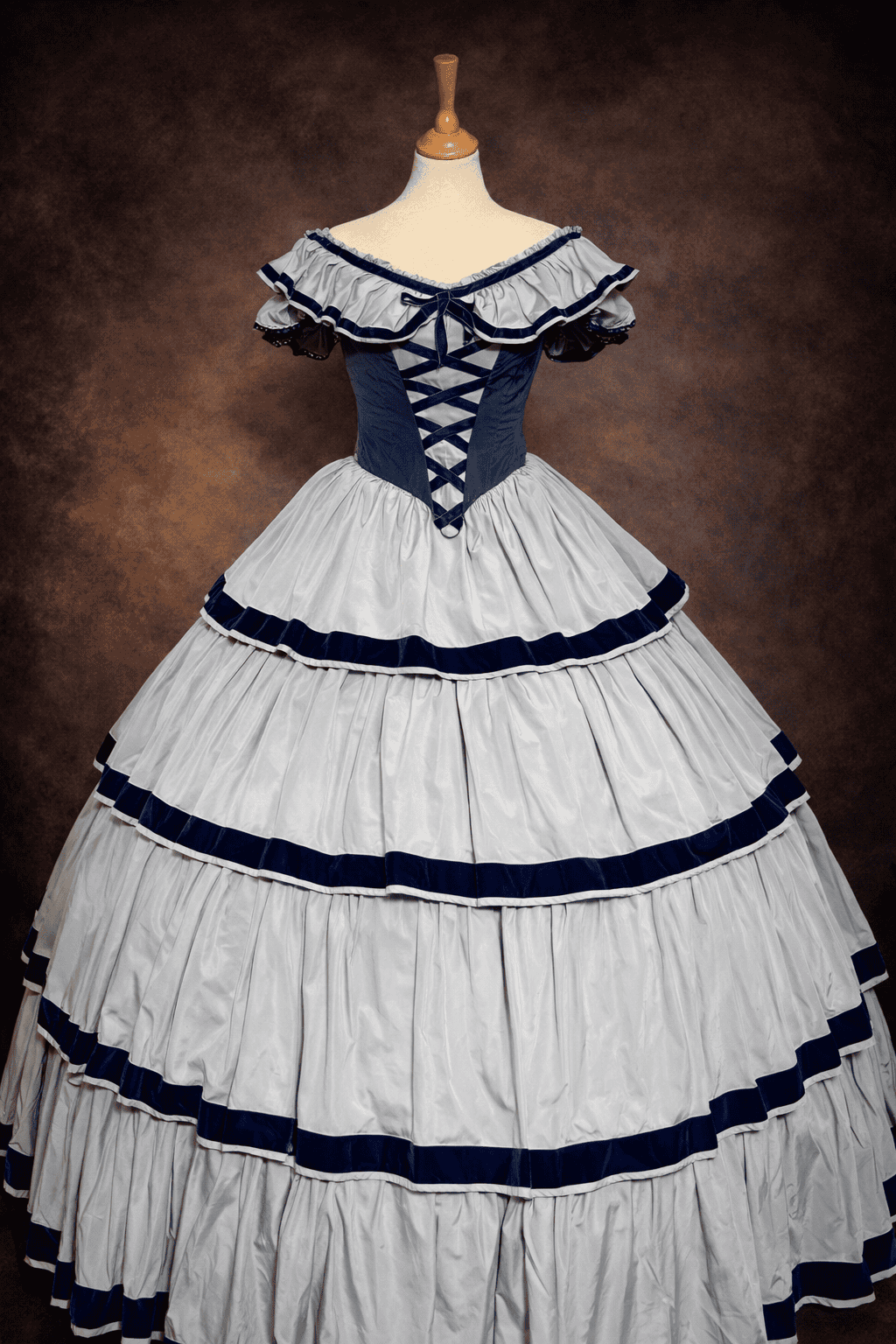 Sur une crinoline se déploie une jupe de soie mélangée gris-bleu. Elle se compose de grands volants animés d’un large ruban de velours bleu marine. Un corset bleu marine embelli d’un laçage décoratif de velours bleu marine. Le décolleté est animé d’un volant de soie mélangée gris-bleu et d’un nœud de velours bleu marine. Les manches ballons apportent une touche d’enfance.