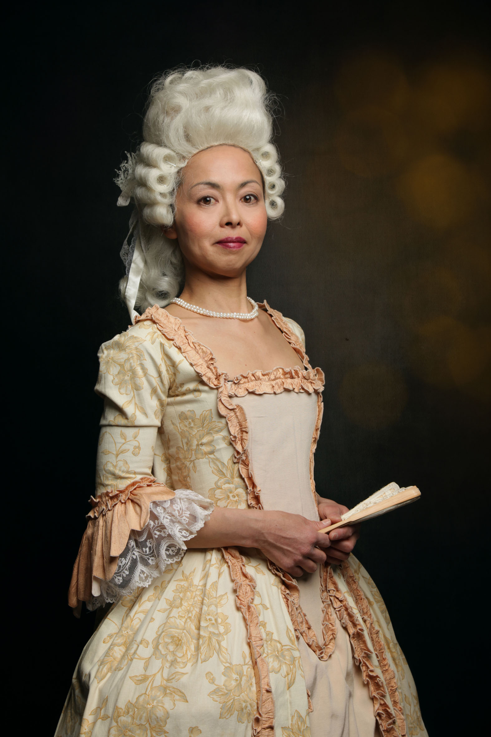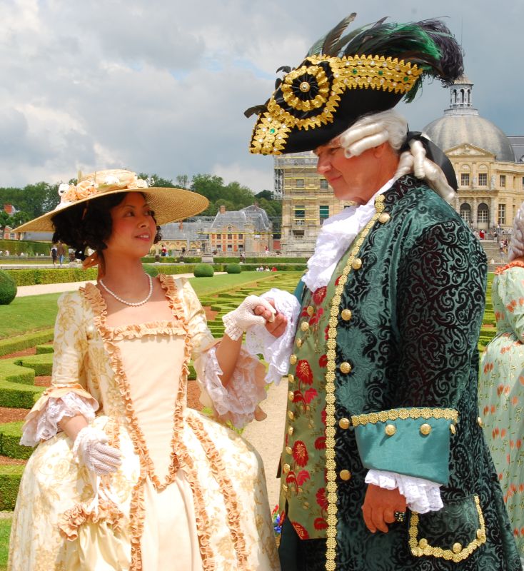 Pour vous accompagner, nous disposons d’un habit XVIII brun et jaune, d’un habit XVIII rouge et kaki et d’une robe XVIII mauve à la française.