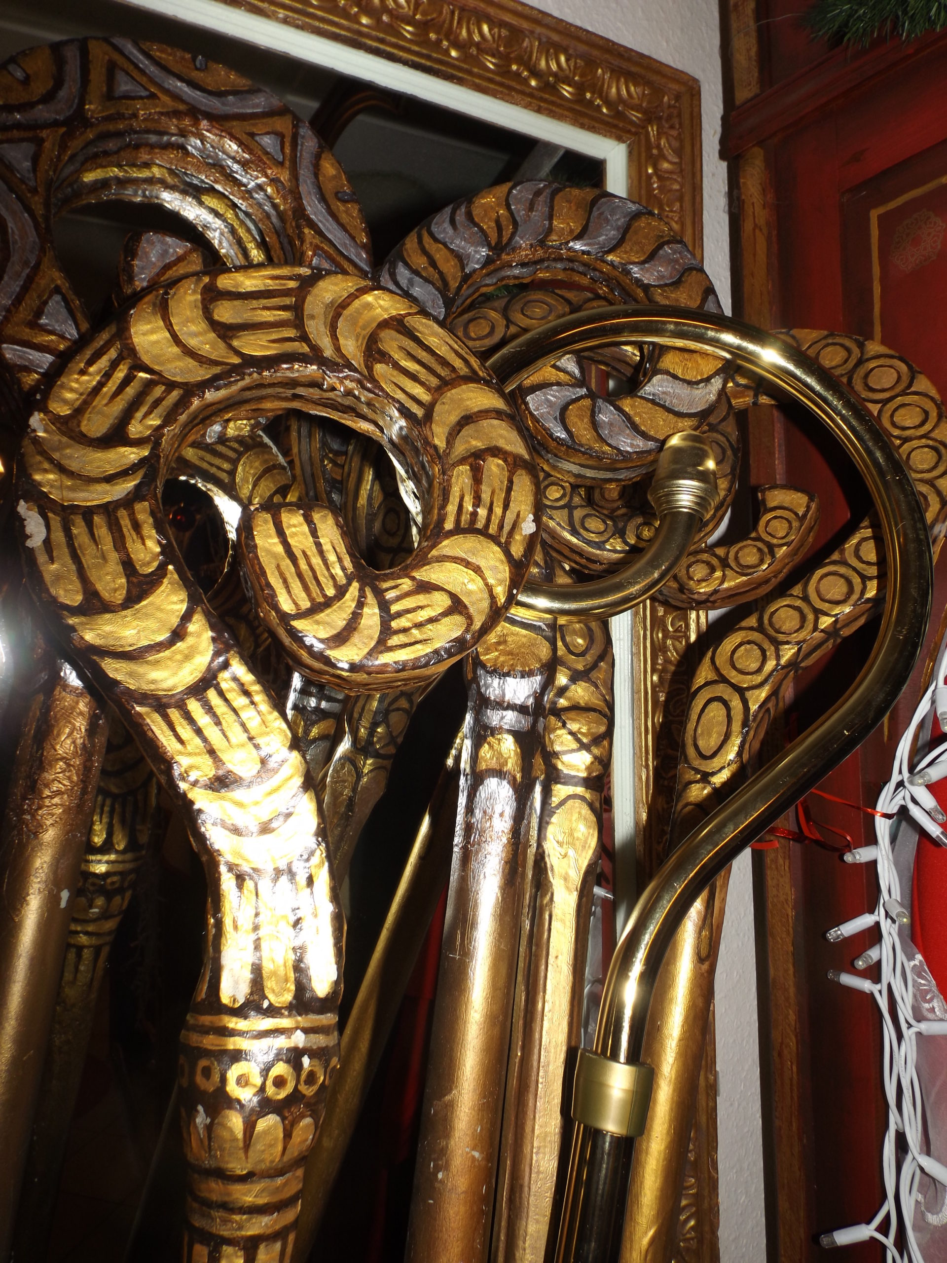 Saint Nicolas était l’évêque de Myre, aussi vous portez les insignes de votre charge : une mitre de velours rouge agrémentée d’un riche galon d’ors mêlés et une crosse dorée.