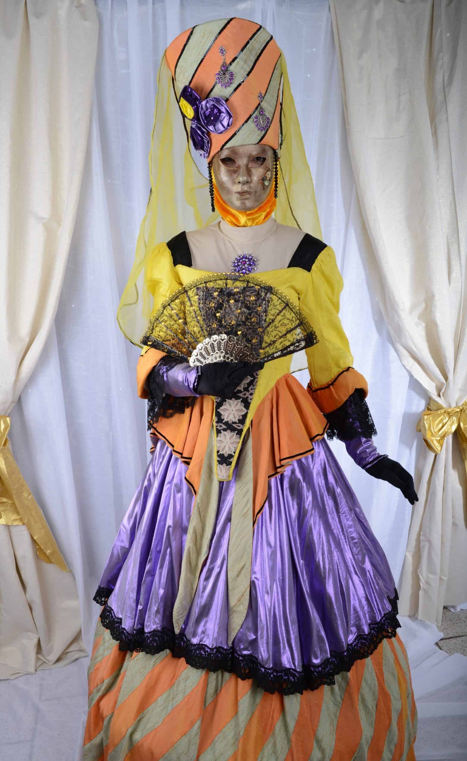 Teatro violetta est un costume vénitien. Jaune, orangé et mauve animent cette incarnation du théâtre impertinent de la commedia dell’arte, élément indissociable du carnaval. Vous êtes attendue avec impatience.