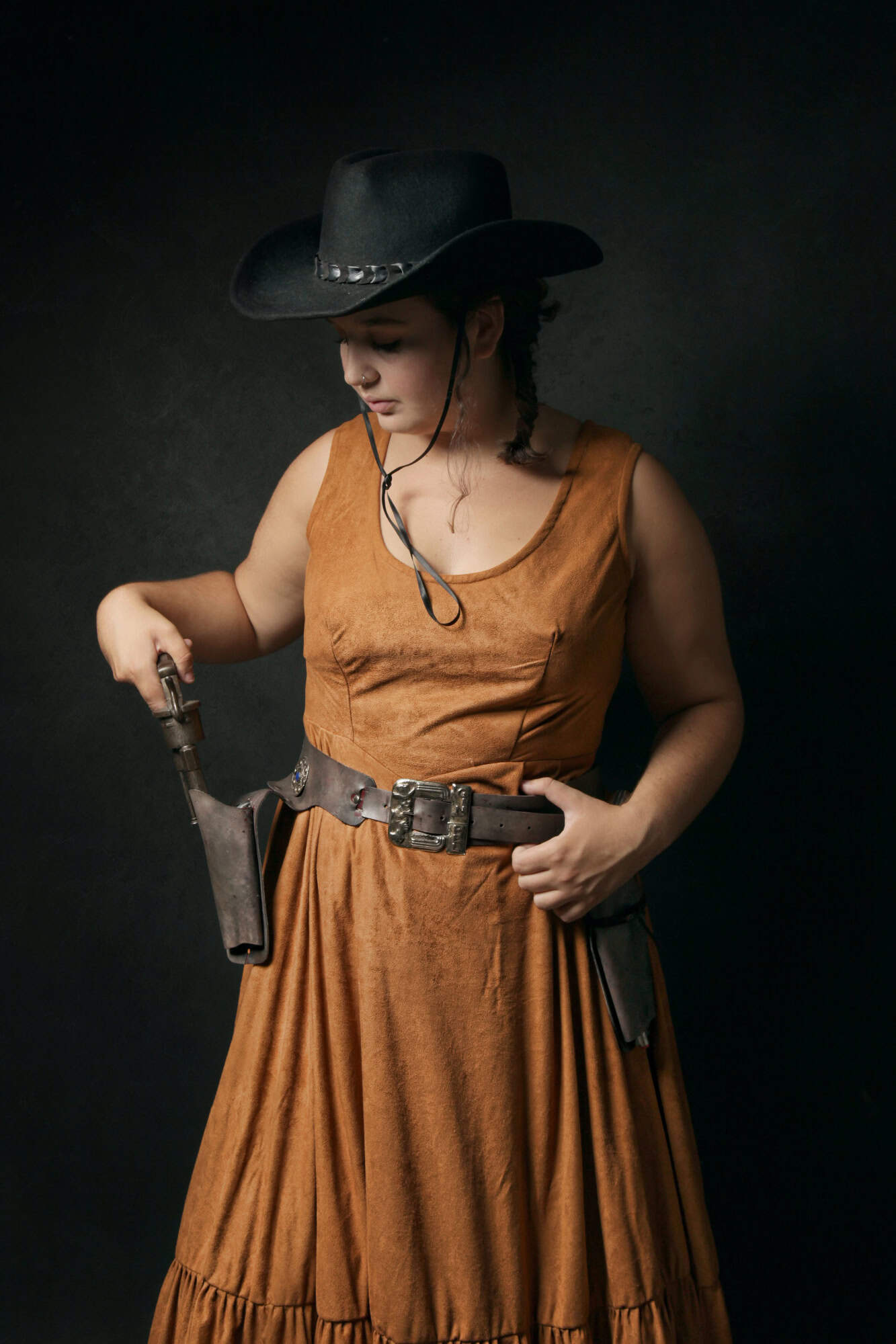 Sur un jupon blanc qui donne du volume, vous portez une robe à bretelles de suédine fine et souple, couleur brun clair tirant légèrement sur le rouille. Un ceinturon marron clair à étui pour sortir armée en toutes circonstances. Un Stetson de feutre noir.